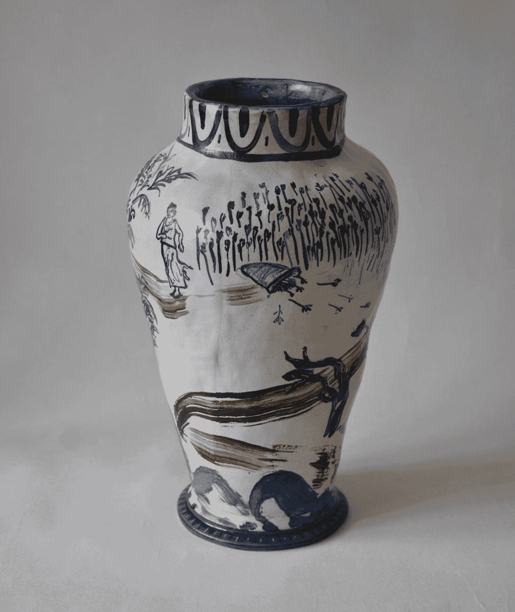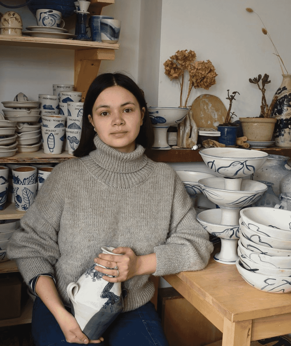 Ella Bua-In‘s ceramics are tactile and imperfect, designed to be handled and cherished. Her work is a narrative in clay, with each piece illustrating stories drawn from diverse sources, such as historical artefacts, Japanese woodblock prints, and the Welsh landscape. Ella’s journey into ceramics began after she completed a BA in Fine Art, teaching herself the craft. Now based in Cardigan, West Wales, she creates pieces that embody a sense of history and personal expression. Her use of ceramic oxides to adorn her pots with intricate illustrations highlights her dedication to merging art with storytelling, offering pieces that resonate with depth and beauty.