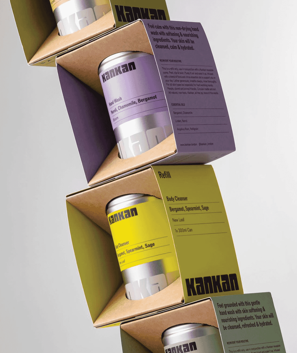 Kankan provides natural hand and body washes in refillable cans with stylish, recyclable packaging. Their modern scents and effective formulas make personal care delightful. Kankan promotes a circular economy by using infinitely recyclable metal cans, post-consumer recycled plastics for pumps, and incorporating waste materials. They plant a tree for every can purchased, supporting environmental regeneration.